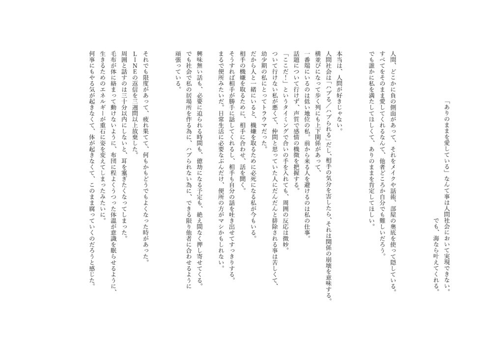 大学3年の時、色々あって人間社会に疲れてしまった時、ふと家から見える海が目に映った事がきっかけである。